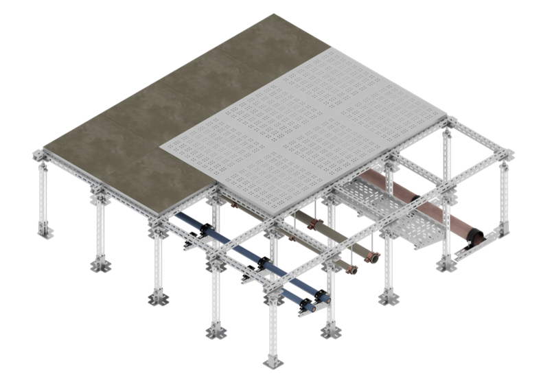 Модульная система для скрытой прокладки инженерных коммуникаций с их защитой от механических повреждений и удобным доступом для обслуживания. Конструкция выдерживает нагрузки от 100 до 12 000 кг/м² и легко адаптируема под любые технические задачи. В ассортименте представлено более 40 вариантов панелей с различными типами покрытий. Возможен монтаж специализированного оборудования, в т. ч. модулей порошкового пожаротушения. Каждый элемент фальшпола можно оперативно заменить без разборки всей конструкции.